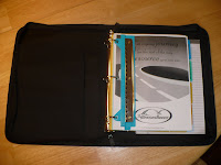 The binder is a canvas-covered, zippered three-ring binder. There's a handle on the spine so that I can carry it like a briefcase if I choose. The front inner cover of the binder has a large pocket for loose papers (a report to bring from one professional to another, perhaps), one pocket for pens or pencils or smaller papers, post-it notes, or photographs (I'd probably go as large as 5 x 7 photo or legal pad here), and two smaller pockets for business cards or something small. The back inner cover holds an 8 x 10 legal pad.